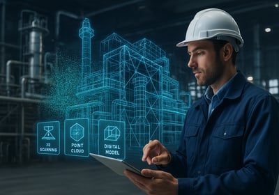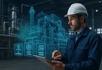 Criação de gêmeos digitais de ambientes industriais para atualização de layouts, planejamento de manutenção, ampliação de processos e integração com sistemas BIM.